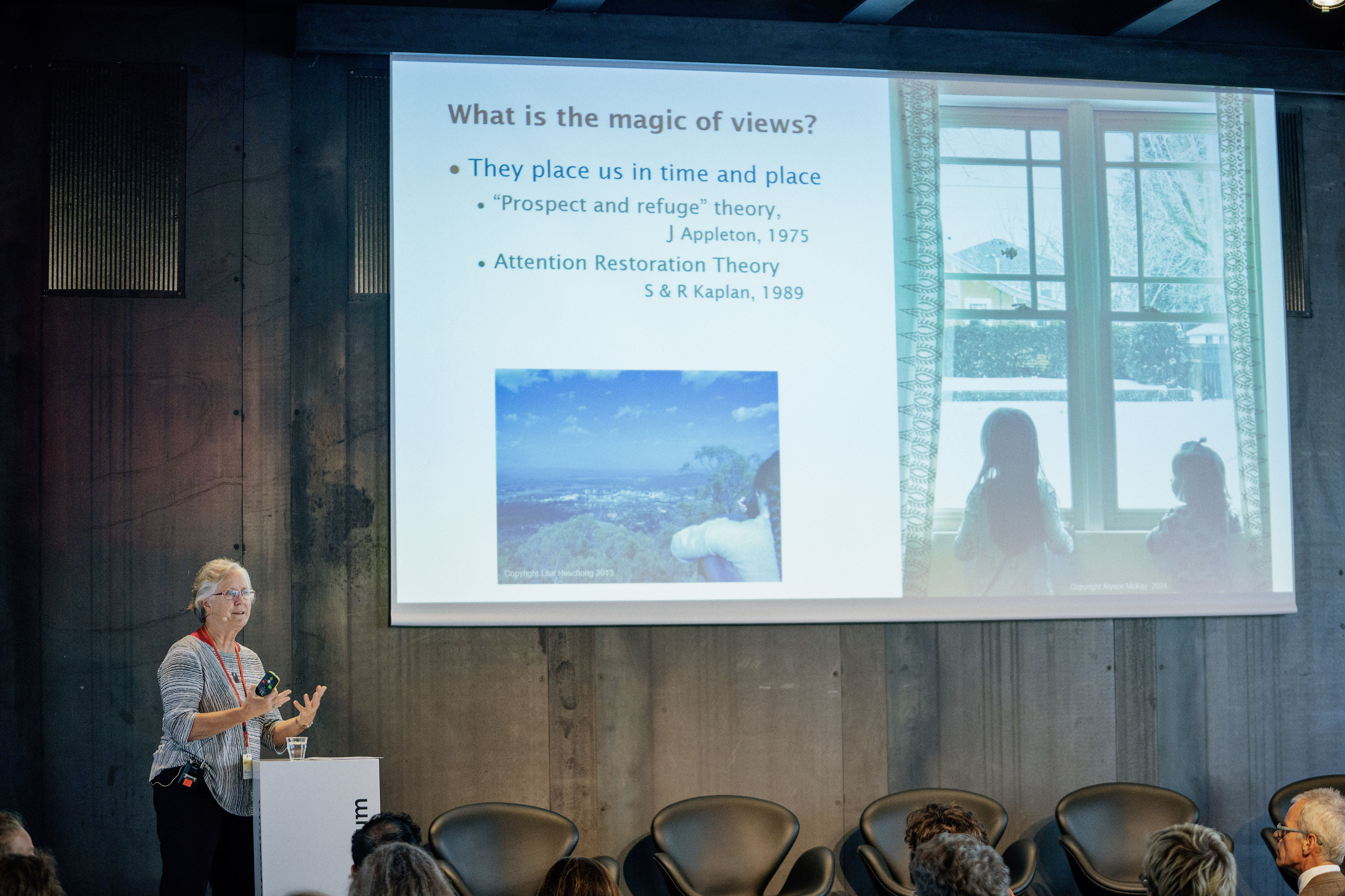 Lisa Heschong, whose pioneering research linked windows and learning outcomes over decades, returned with a new vocabulary for the emotional side of circadian design. She described windows as providers of “circadian snacks,” those unconscious glances to the outside seeking the natural light we need for our internal clocks. The “magic of views places us in time and place,” she opened. Daylight and the horizon act together as anchors for the mind’s wandering, feeding the brain’s creative default network. Heschong also raised a new concern: high-performance glazing, while efficient, may filter out up to 90 % of certain blue-light frequencies essential for this to happen.