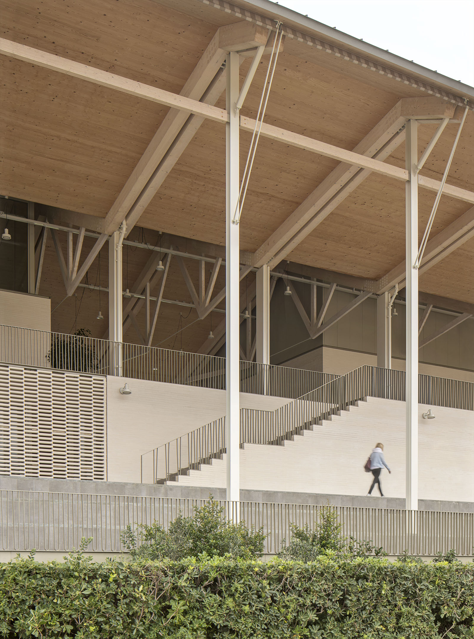 The building’s roof extends to form the grandstand of the show jumping arena, now enlarged to host major equestrian events. This new layout improves visibility and increases capacity, while the use of topography and restrained building height ensures the facilities blend harmoniously with their surroundings. The result is a respectful intervention that maintains the open character of the site and aligns with the scale of nearby structures.