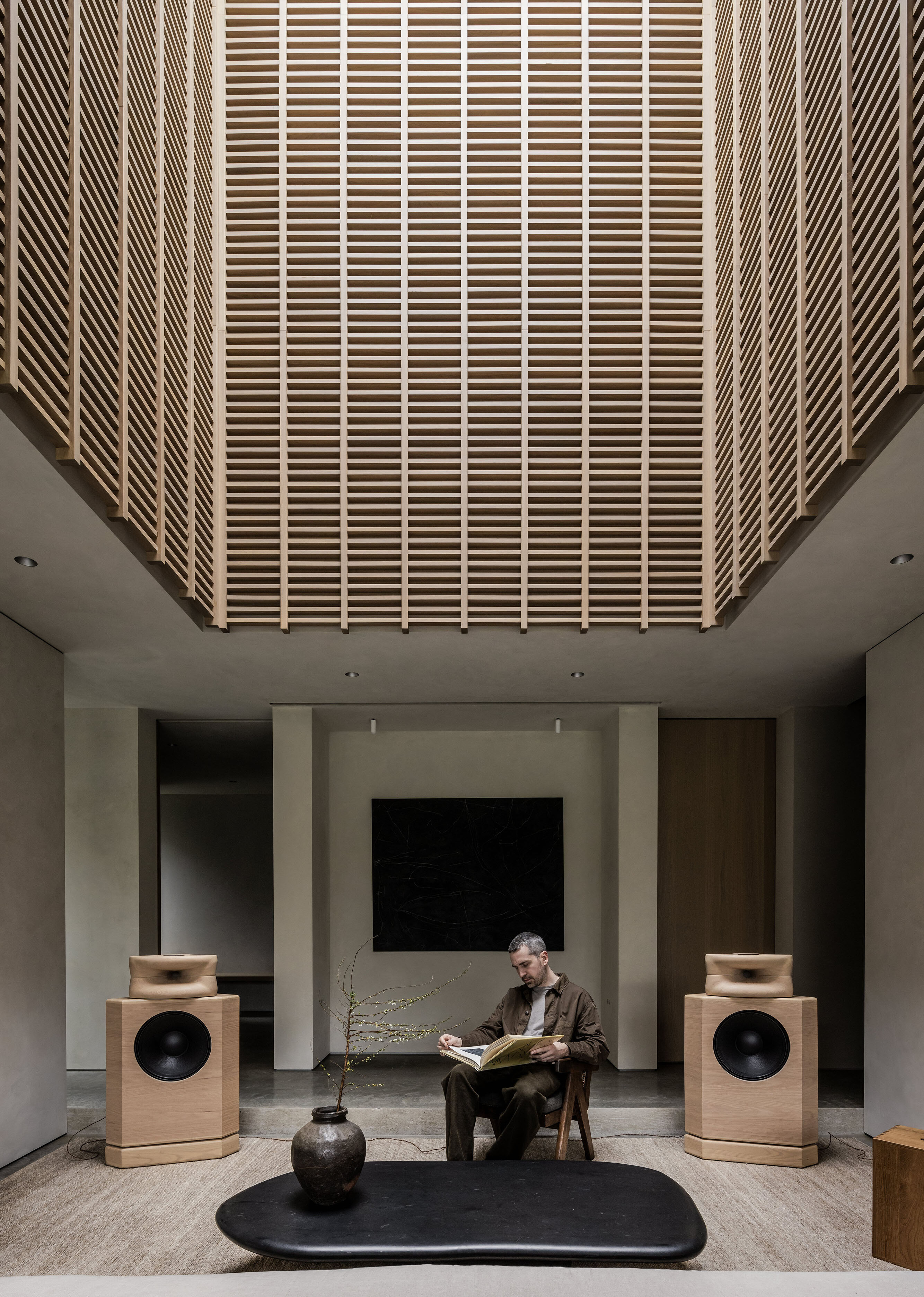 The terrain is informal, with native grasses and wildflowers. From outdoors, the house appears mysterious. A recessed doorway and veiled glass provide privacy, while layered volumes create private outdoor areas. Inside, the movement is coordinated by light and shadow, ranging from dim entrance to bright hall.