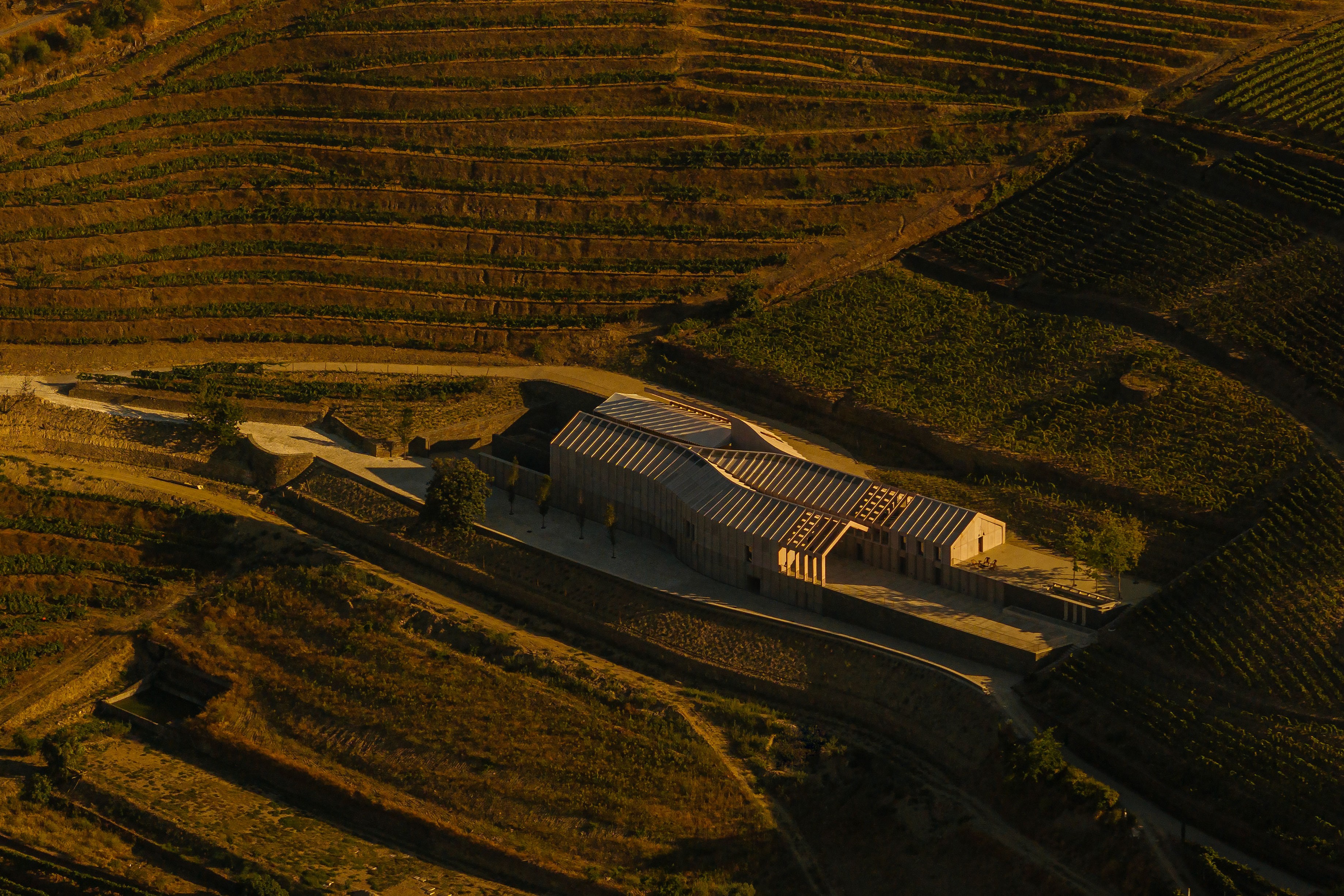The rooftop features a visitor terrace with fruit trees and panoramic views of the Douro, while the main entrance houses a wine shop, reception, and tasting gallery overlooking the ageing area. A glass-walled meeting room and access to a historic chapel enrich the visitor experience. The project promotes prestigious wine tourism while celebrating the region’s natural and cultural heritage.