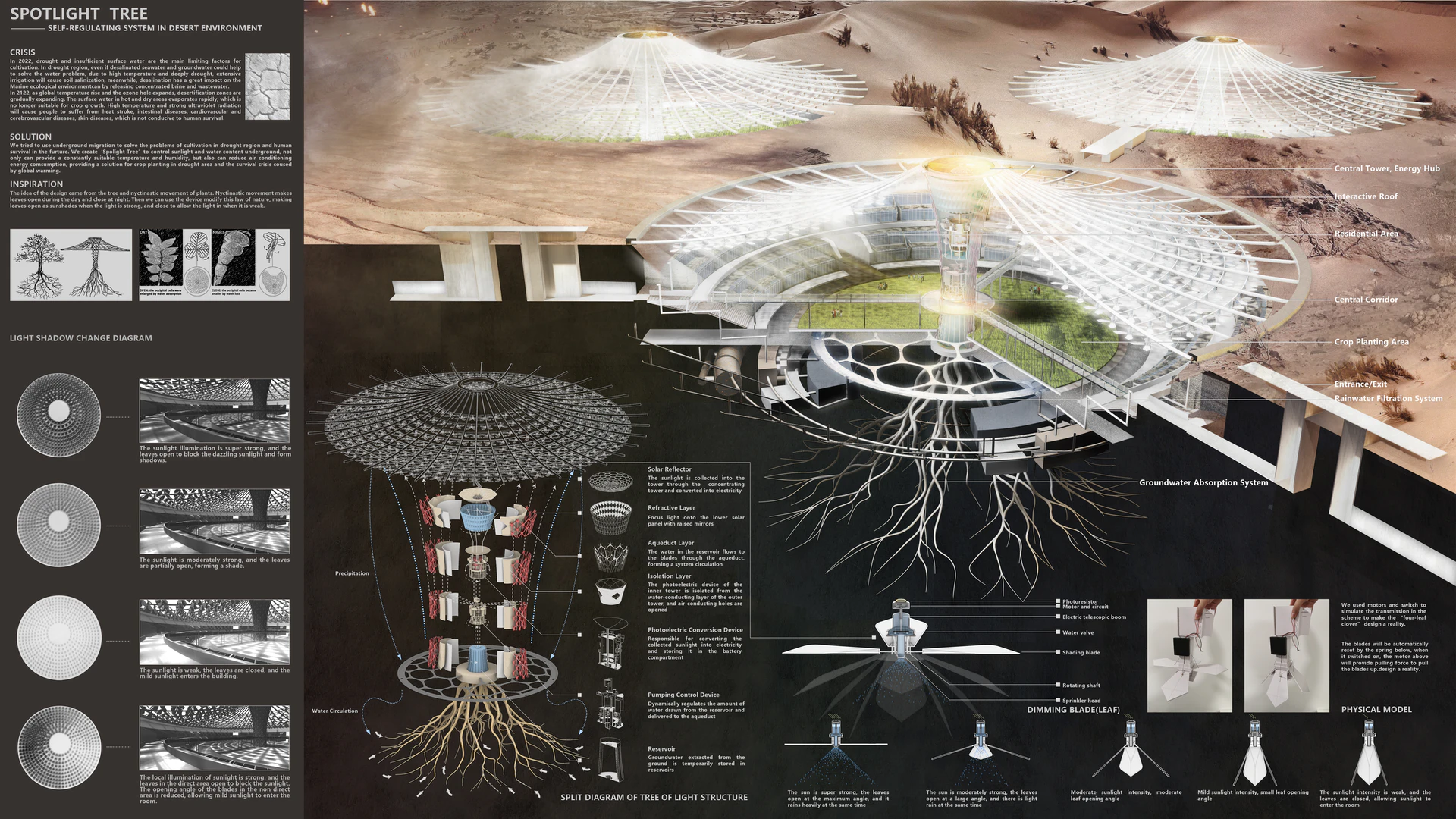 In 2022, drought and insufficient surface water are the main limiting factors for cultivation. In drought region, even if desalinated seawater and groundwater could help to solve the water problem, due to high temperature and deeply drought, extensive irrigation will cause soil salinization, meanwhile, desalination has a great impact on the Marine ecological environmentcan by releasing concentrated brine and wastewater.<br /><br />In 2122, as global temperature rise and the ozone hole expands, desertification zones are gradually expanding. The surface water in hot and dry areas evaporates rapidly, which is no longer suitable for crop growth. High temperature and strong ultraviolet radiation will cause people to suffer from heat stroke, intestinal diseases, cardiovascular and cerebrovascular diseases, skin diseases, which is not conducive to human survival.<br /><br />We tried to use underground migration to solve the problems of cultivation in drought region and human survival in the furture. We create‘Spolight Tree’to control sunlight and water content underground, not only can provide a constantly suitable temperature and humidity, but also can reduce air conditioning energy comsumption, providing a solution for crop planting in drought area and the survival crisis coused by global warming.<br /><br />The idea of the design came from the tree and nyctinastic movement of plants. Nyctinastic movement makes leaves open during the day and close at night. Then we can use the device modify this law of nature, making leaves open as sunshades when the light is strong, and close to allow the light in when it is weak.